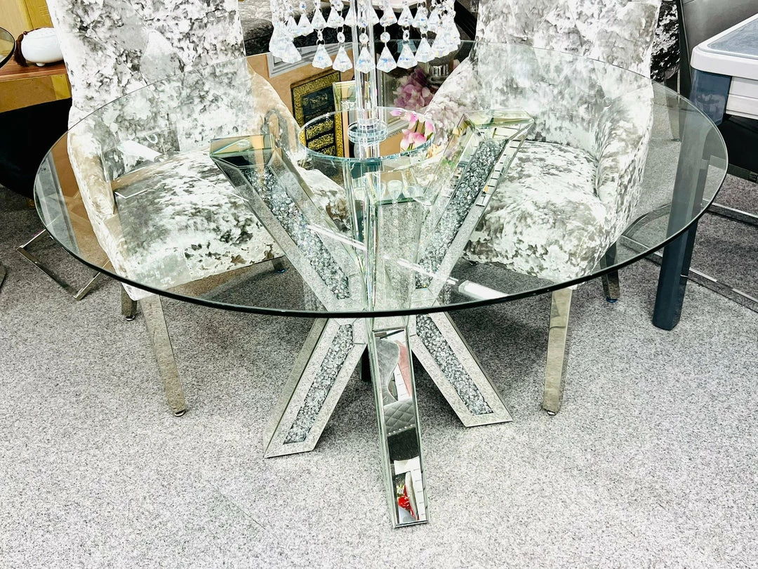 Beautiful round crushed diamond dining table with glass top and diamond base.
