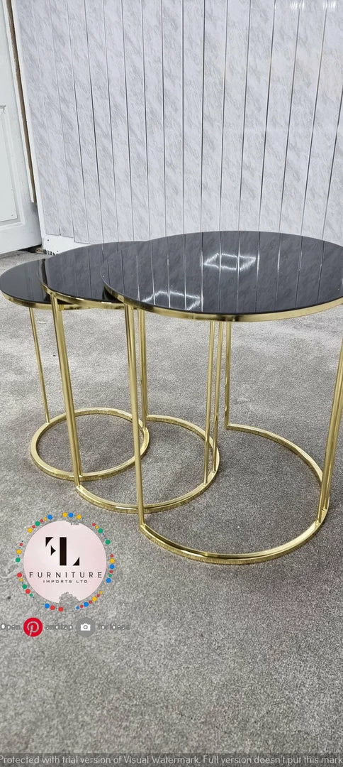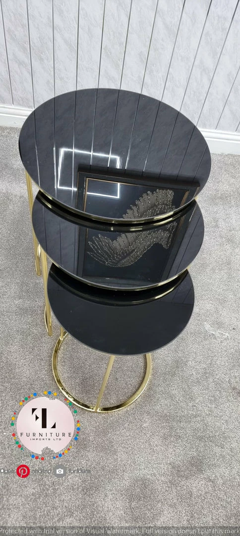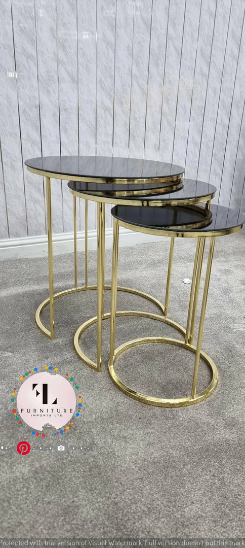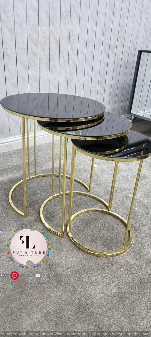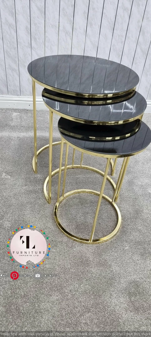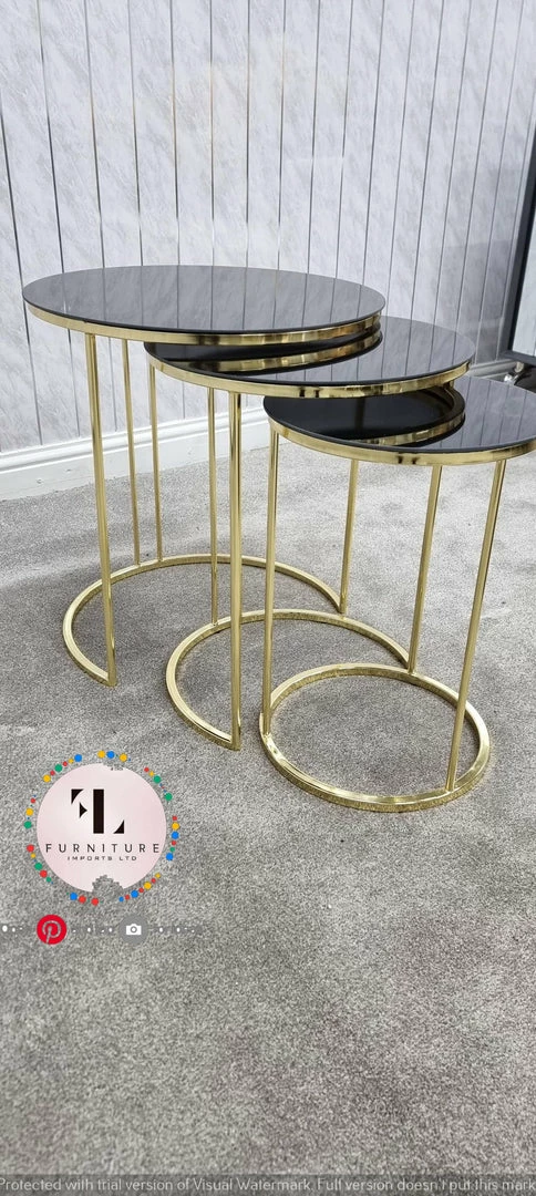 Here is Our Beautifulย Ayla Nest Of 3 Tables In A Beautiful Black Glass With Gold Metal or White Glass With Chrome Surround & Legs