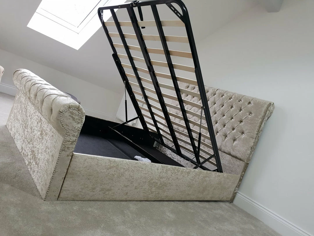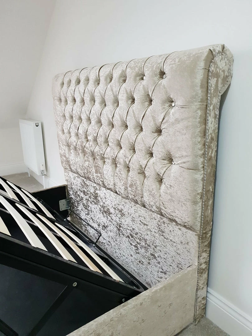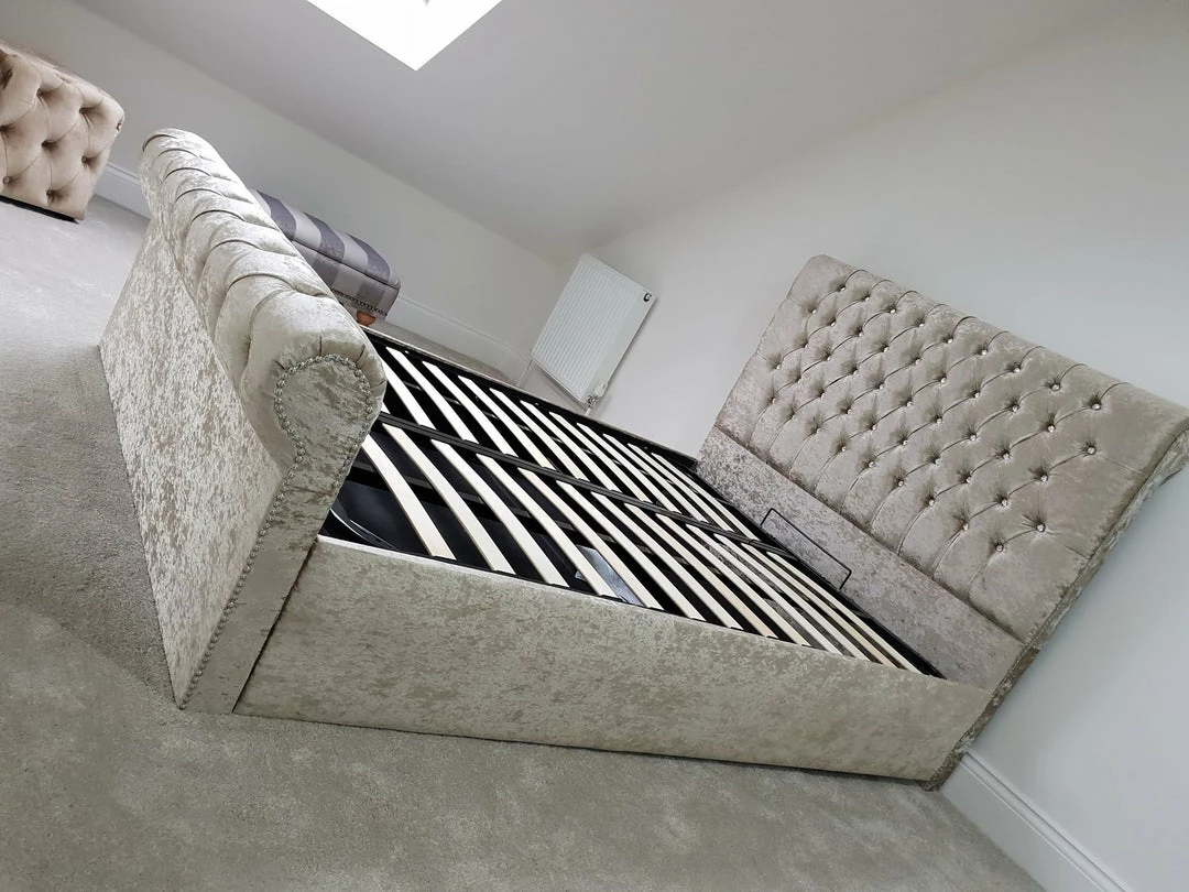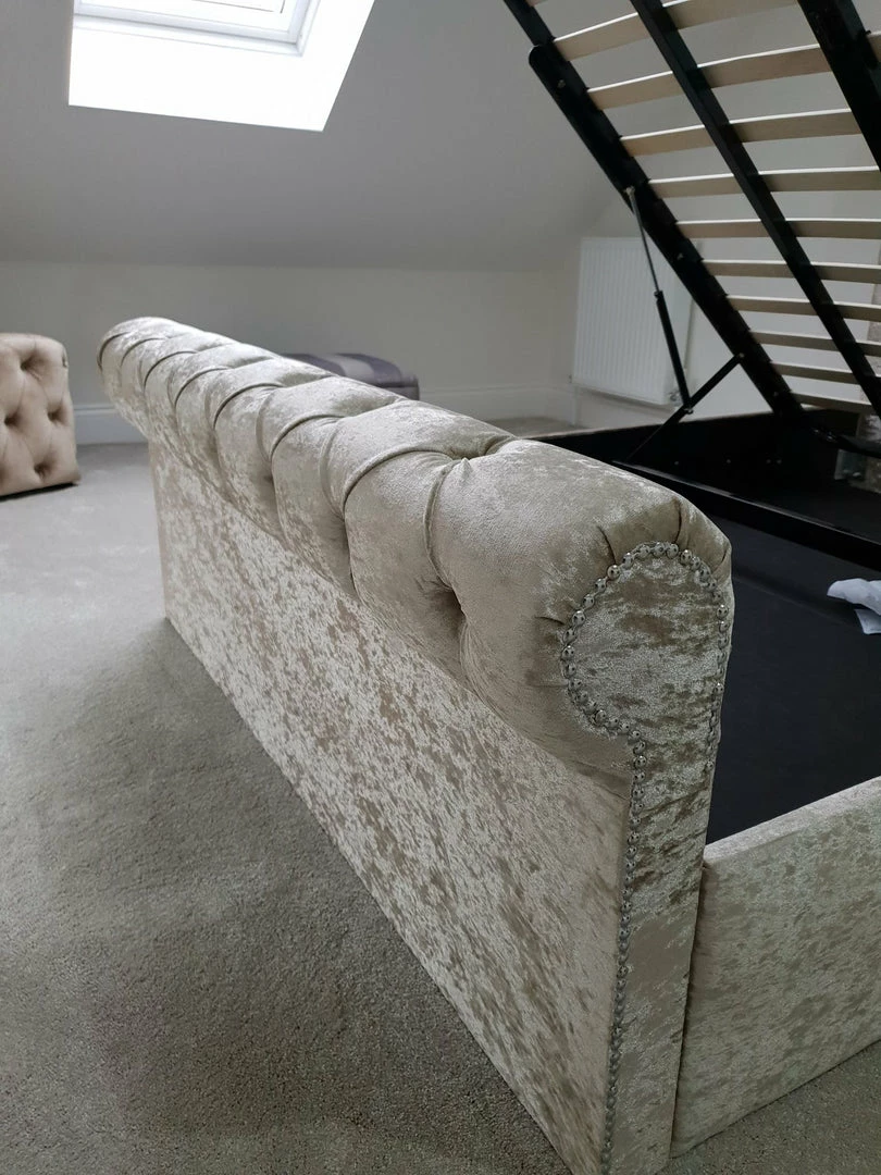 For a real showpiece choose the Sleigh Chesterfield velvet Bed Frame for your bedroom. This outstanding bed frame boasts a unique upholstery design and a sumptuous, sleigh bed shape. It has a large foot end to create a more broad look