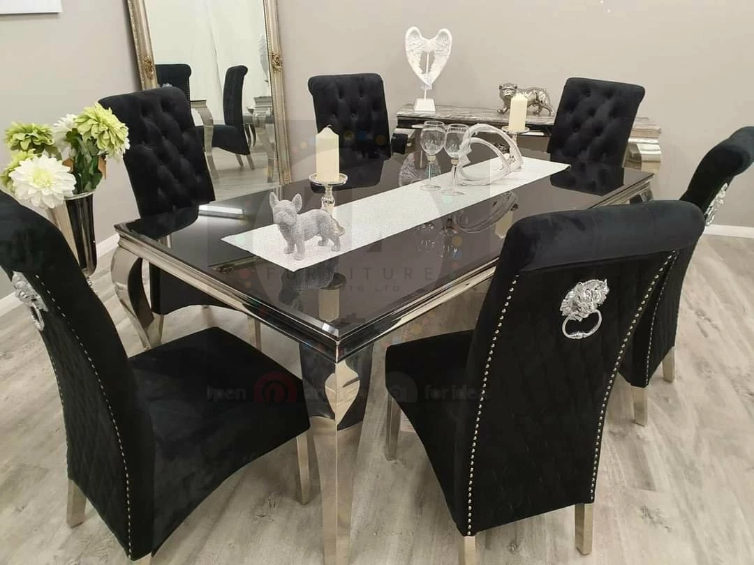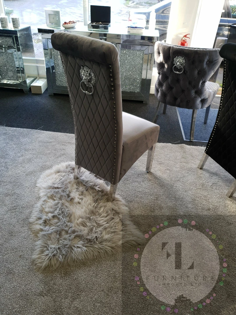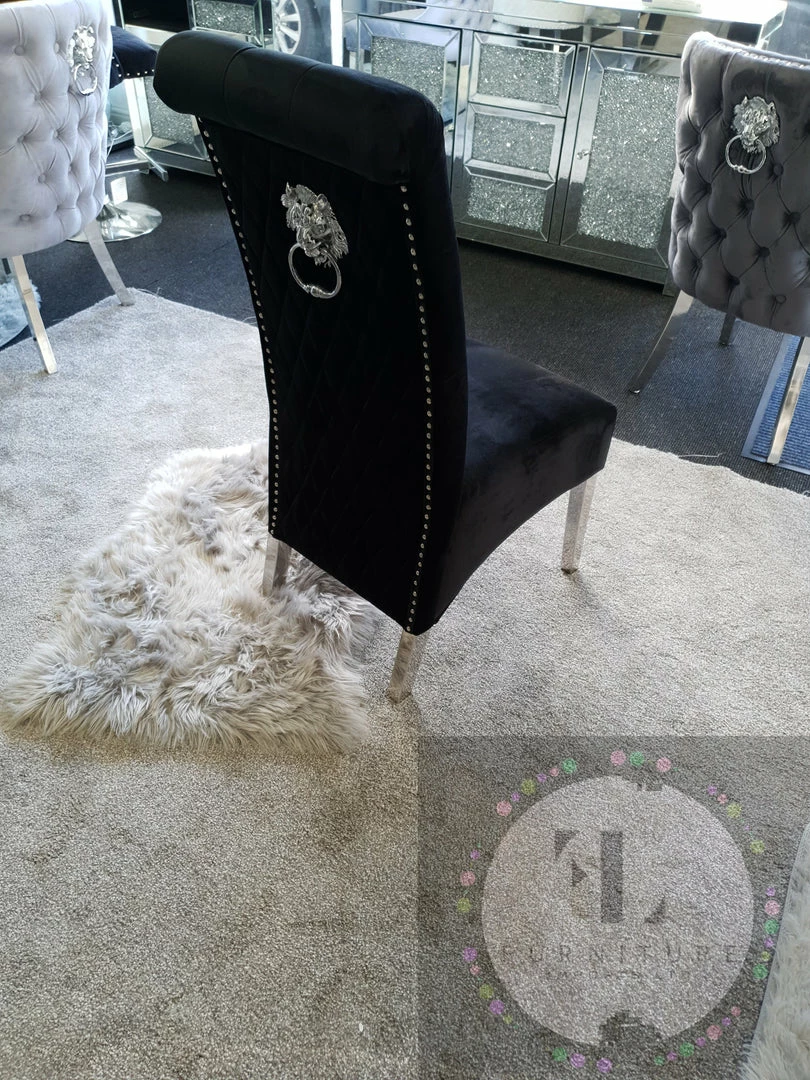 The Komoro dining chairs stand tall, perfectly upholstered, clean smooth velvet with a beautiful tidy checkered upholstery. It comes with beautiful shiny chrome stainless steel legs and a large lion knocker center piece. These velvet dining chairs will stand out in any room whether it has carpet or laminate