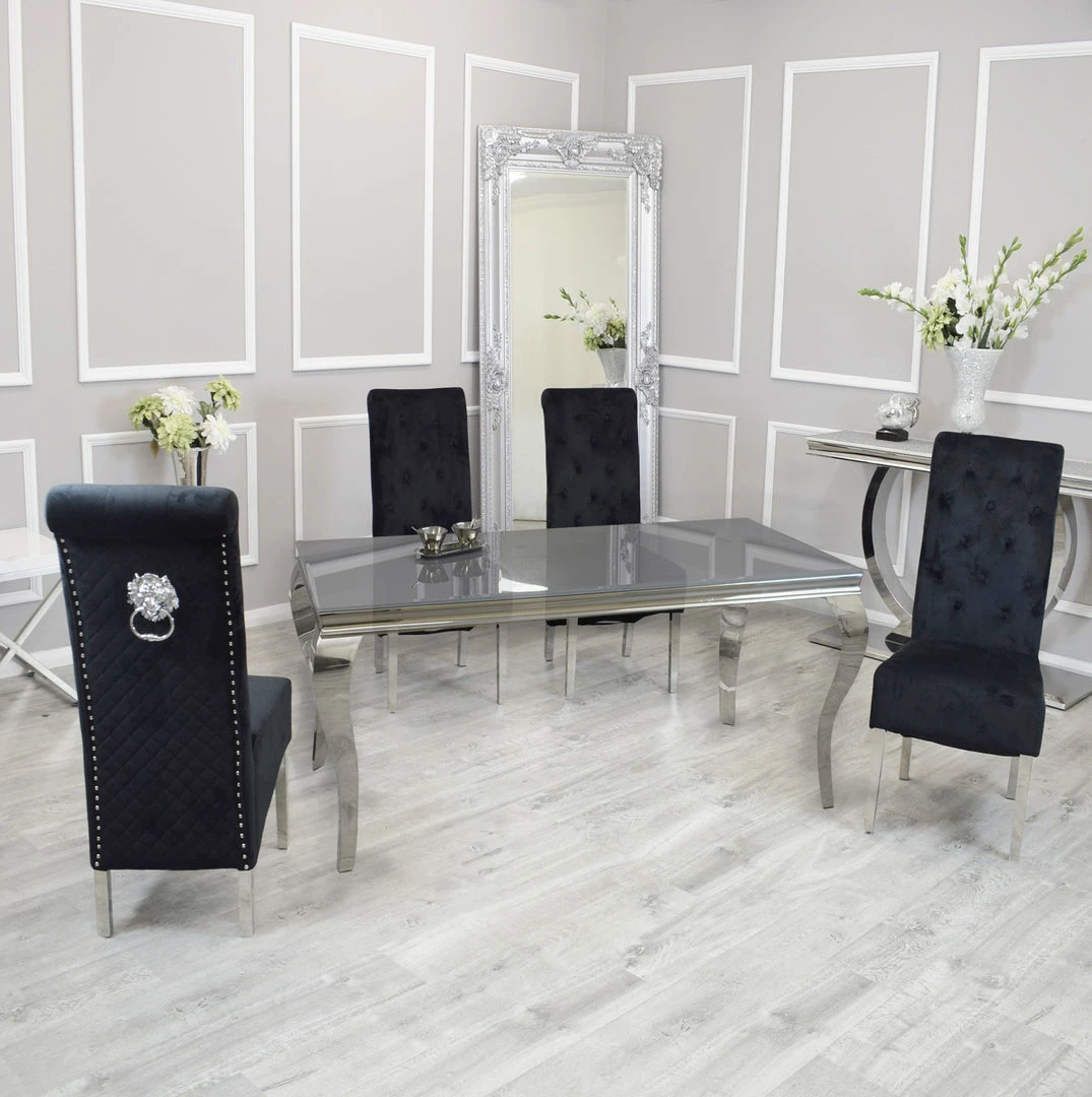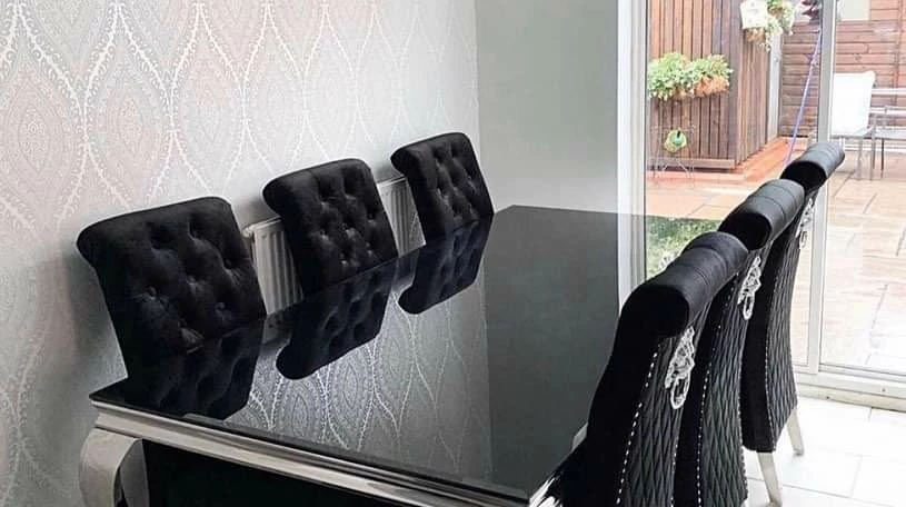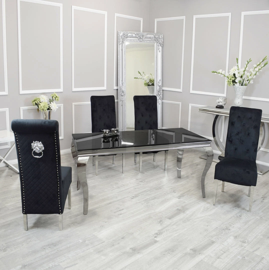 The Sofia Dining Table Set features with two unique products to create a masterpiece dining set. It has the Imperial Dining Table which is a contemporary modern version of a traditional French rococo style dining Table with its polished steel legs and frame and Black or White Glass Top and the Sofia Dining Chairs