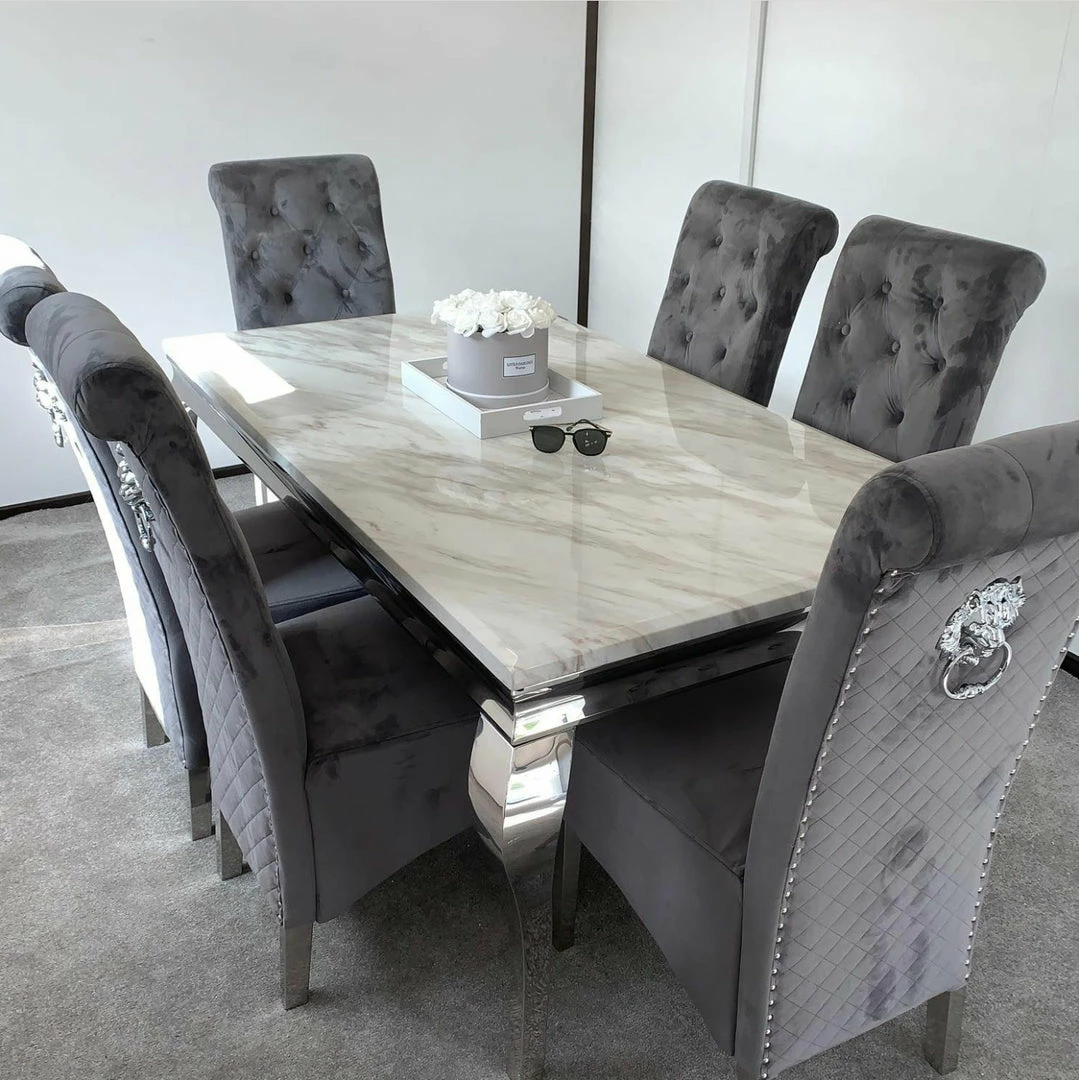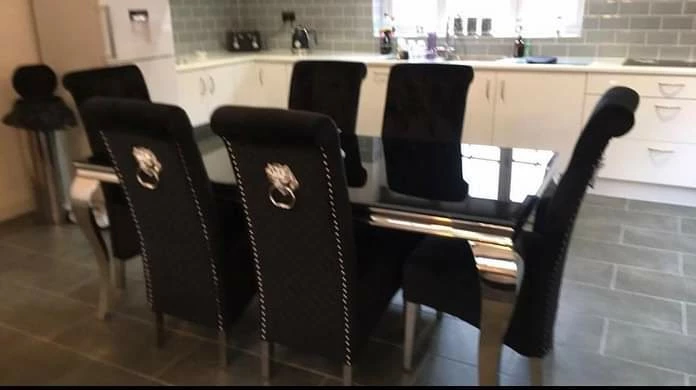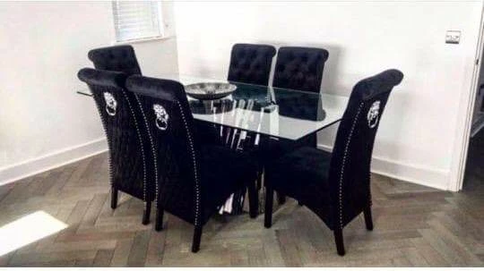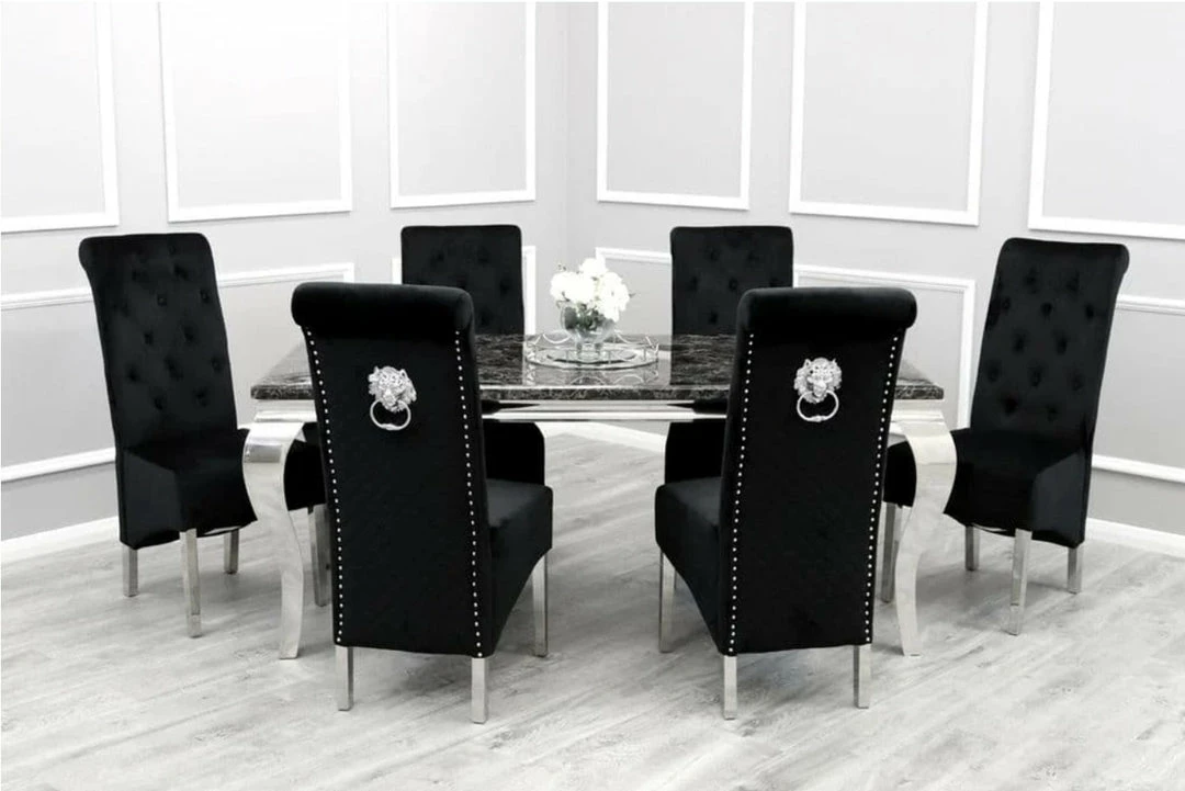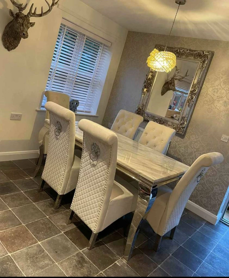 The Sofia dining chairs stand tall, perfectly upholstered, clean smooth velvet with a beautiful tidy checkered upholstery. It comes with beautiful shiny chrome stainless steel legs and a large lion knocker center piece. These velvet dining chairs will stand out in any room whether it has carpet or laminate