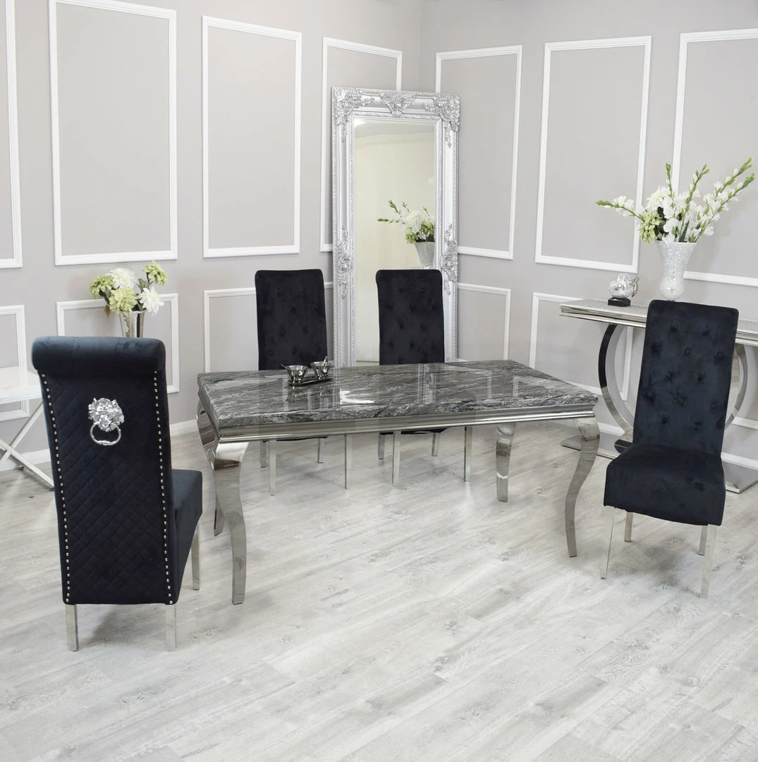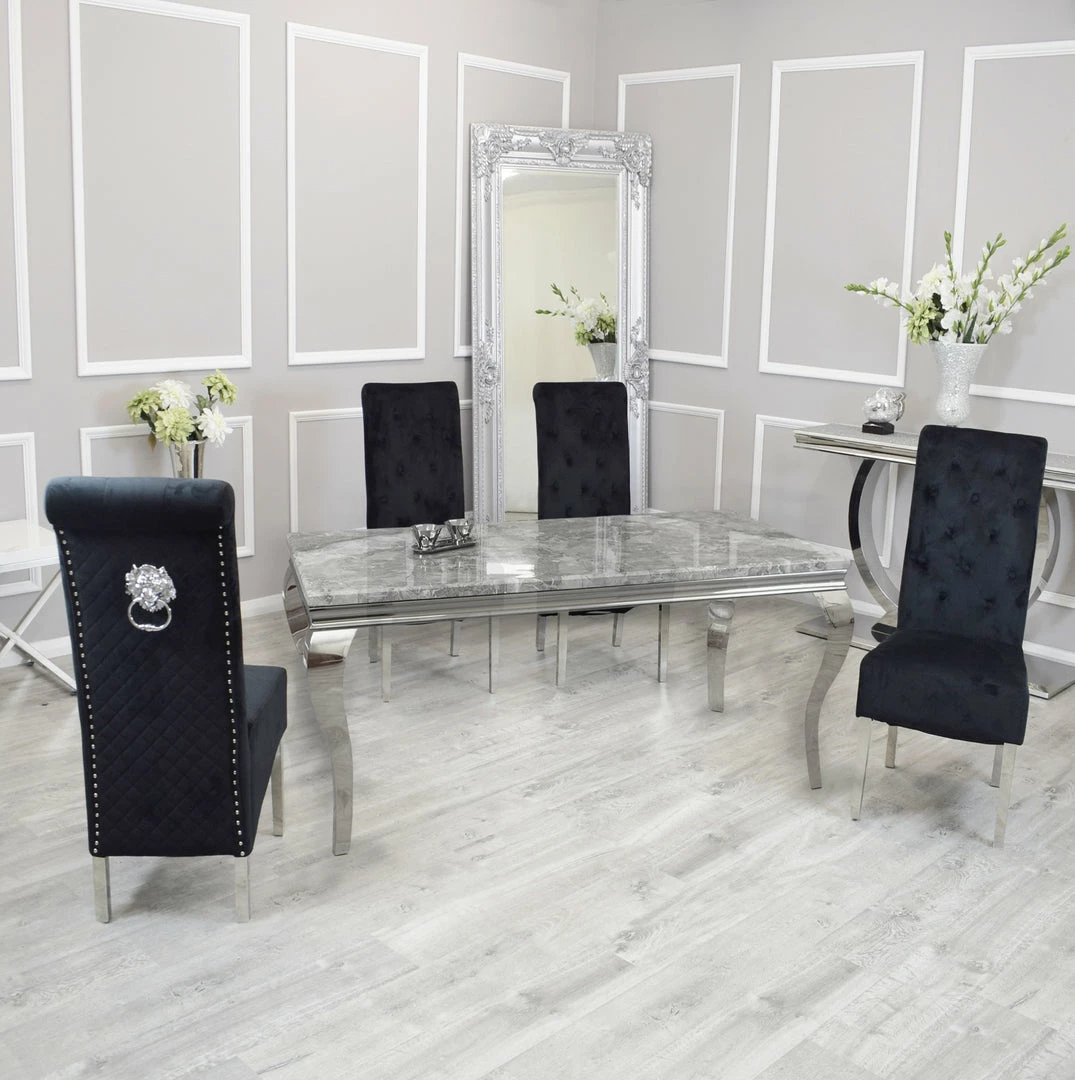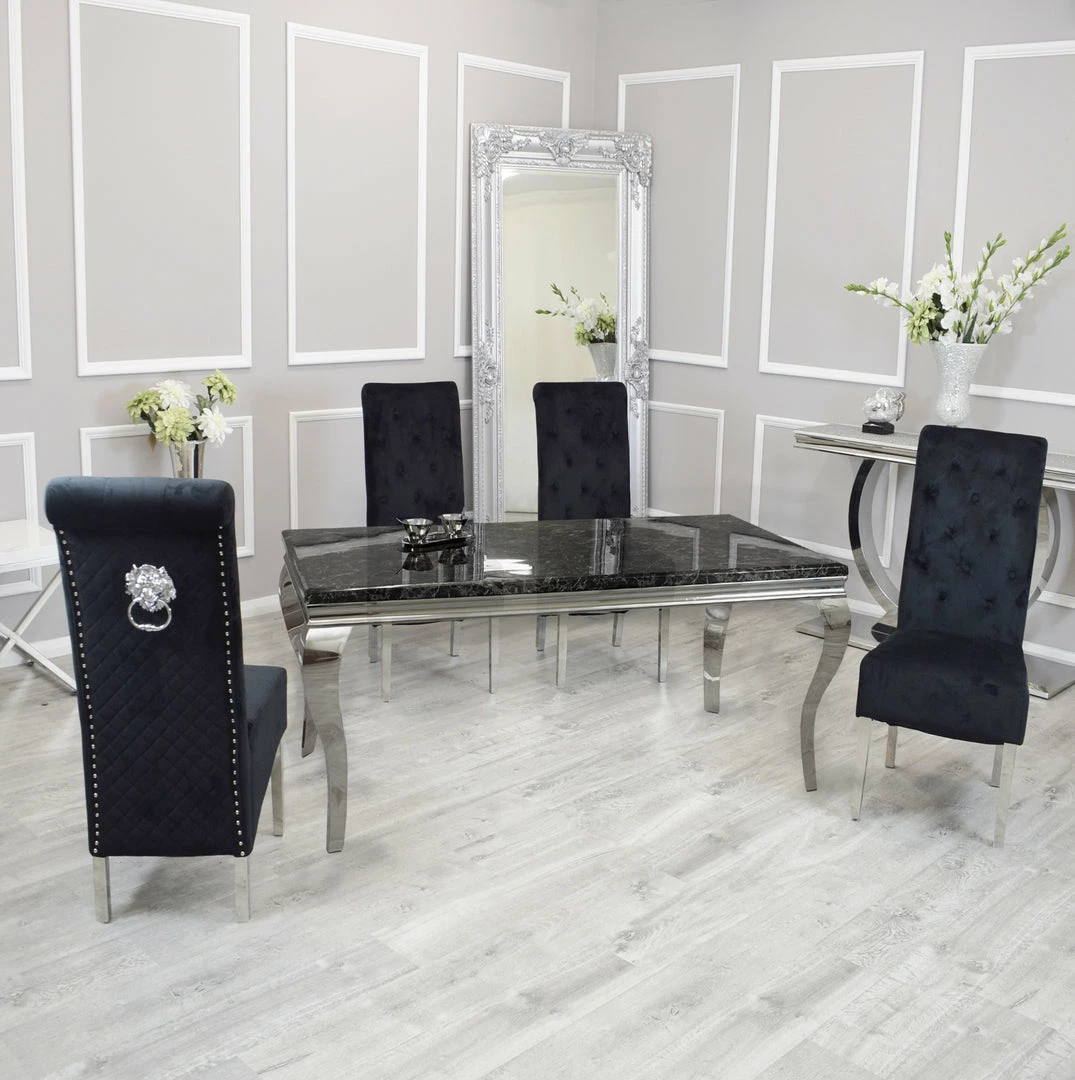 The Sofia dining chairs stand tall, perfectly upholstered, clean smooth velvet with a beautiful tidy checkered upholstery. It comes with beautiful shiny chrome stainless steel legs and a large lion knocker center piece. These velvet dining chairs will stand out in any room whether it has carpet or laminate