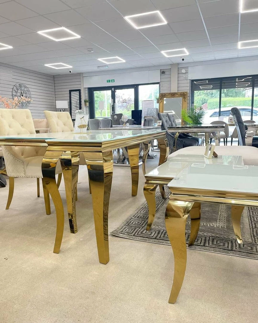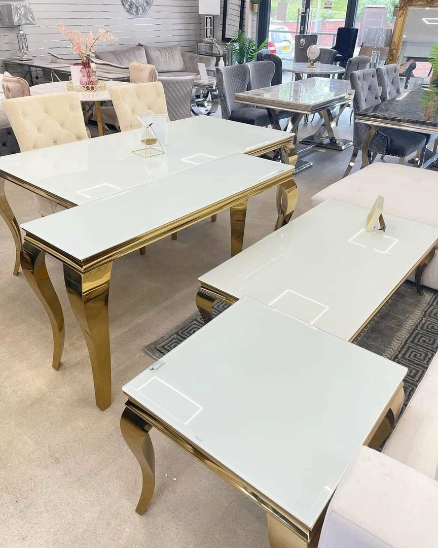 The new 2020 designย Louis Gold Dining Table with a contemporary design and temperament, theย choice of white, black or grey glass withย gold dining table frame is an exquisite piece of furniture. This dining table has a distinct manufactured look and feels that is undeniable. Its stunning design has it all, and it’s very contemporary. Focused attention and a powerful statement of excellence is a presentation of this table