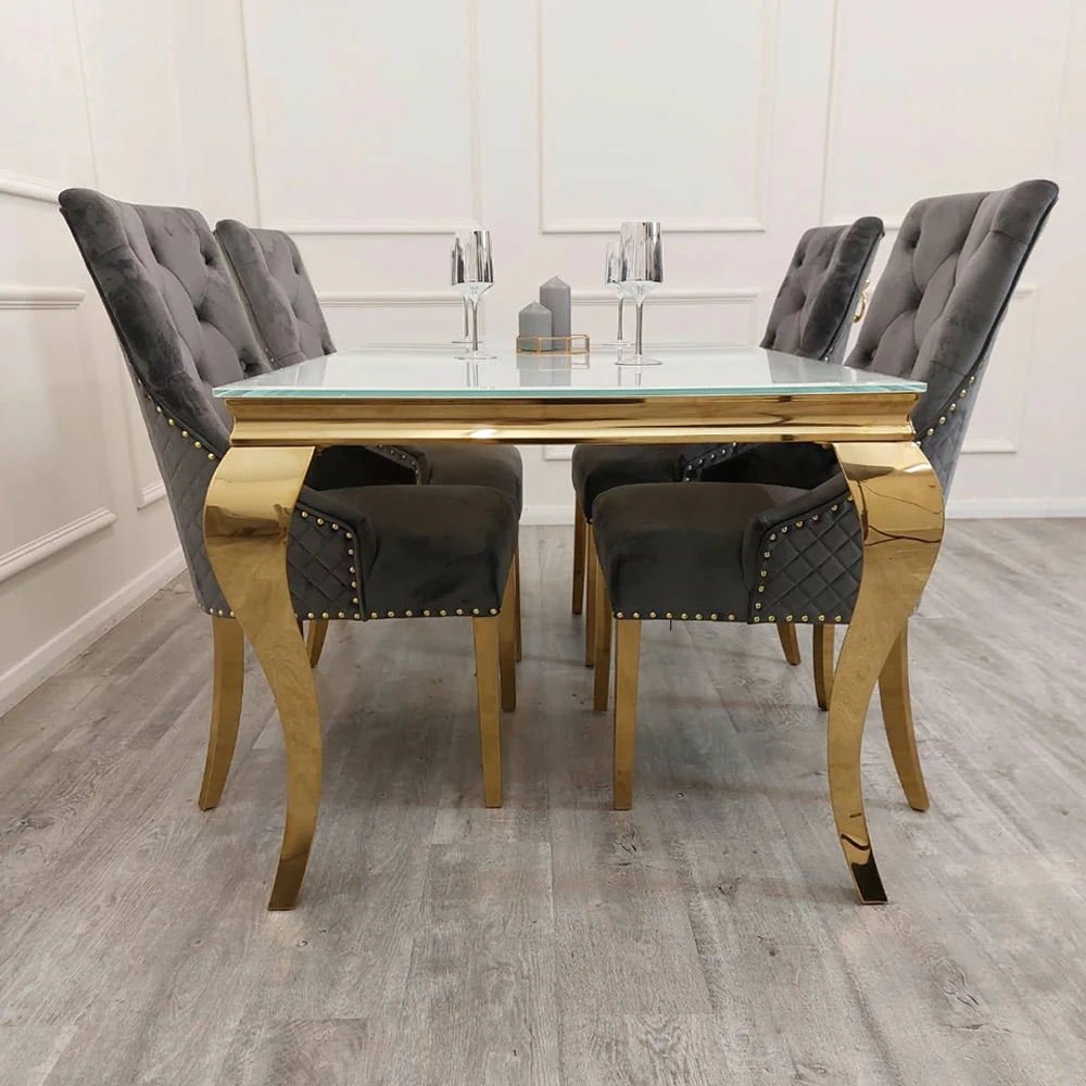 Louis Dining Table Frame Gold + Majestic Gold Dining Chair with Lion Knocker & Quilted Back