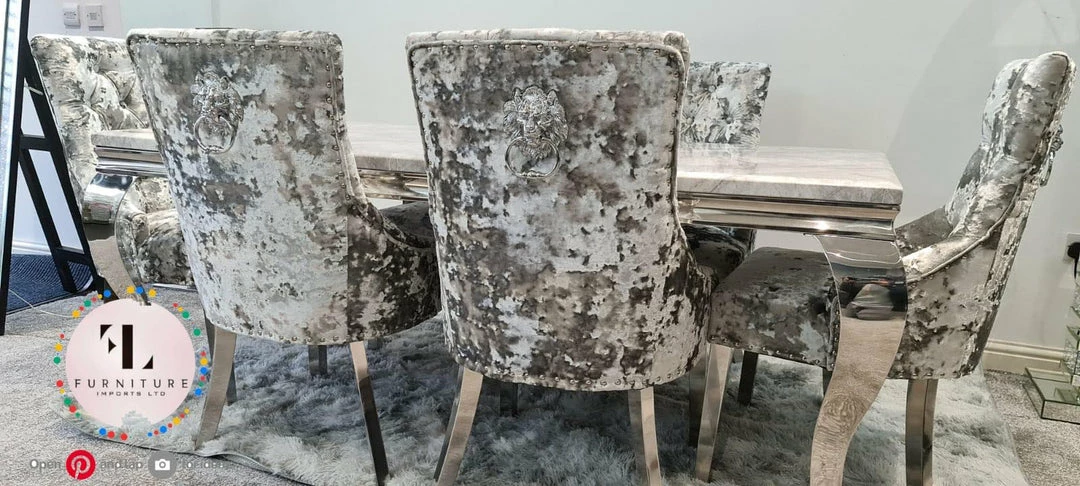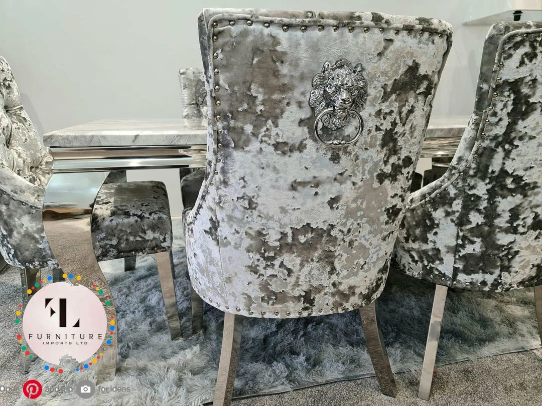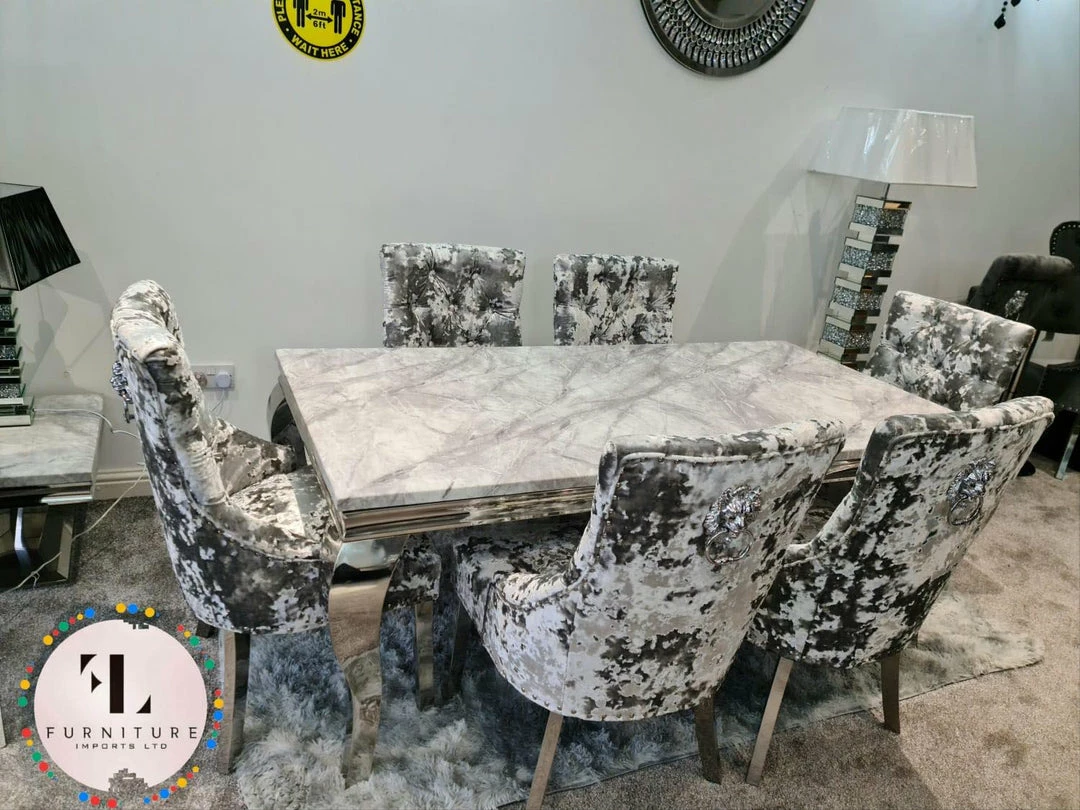 The Danetti Dining Set consists of the Imperial Solid Marble Table with the finest Lustro Velvet Dining Chairs In the Market