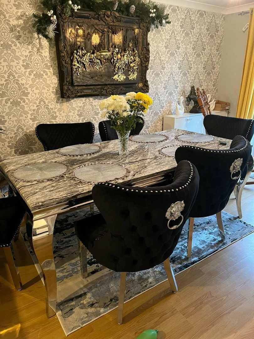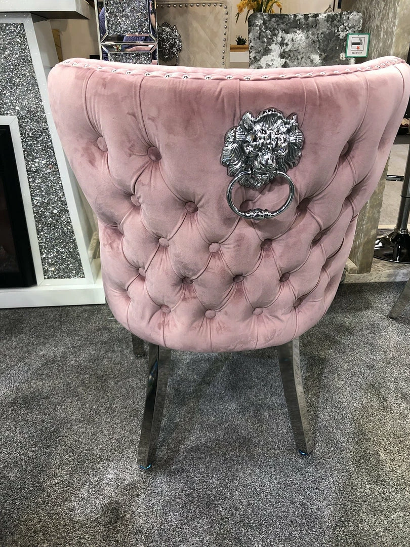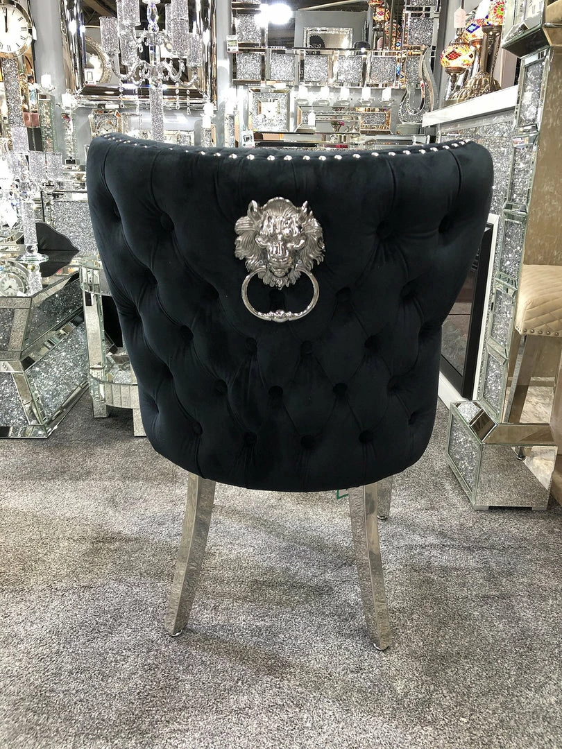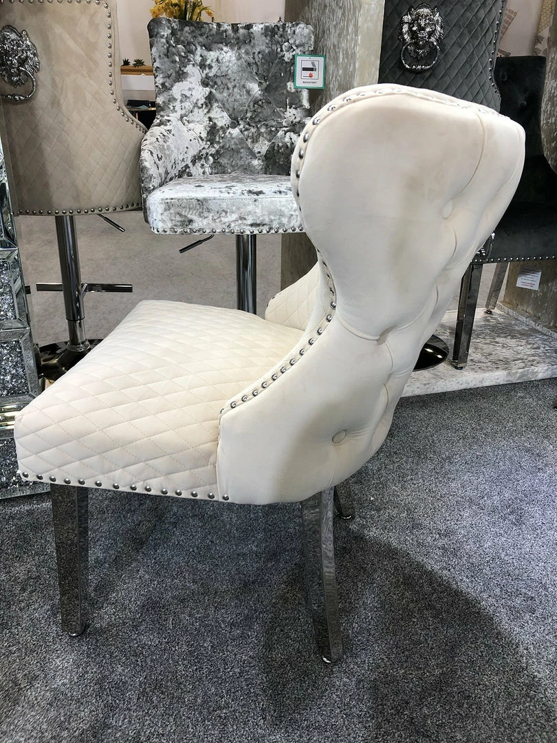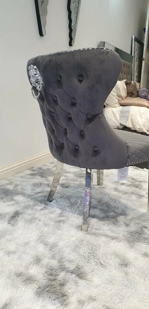 Elegantlyย designed to conquer any modernย interior. This grand Valentino dining chair embodies a prestigious & ergonomic design, with an elegantly wrapped smoothed brushed velvet fabric, swivel, comfortable padding, chic chrome legs, soft tuftedย buttons, a lavish lion knocker back and last but not least a rich pearl embedded detailingย