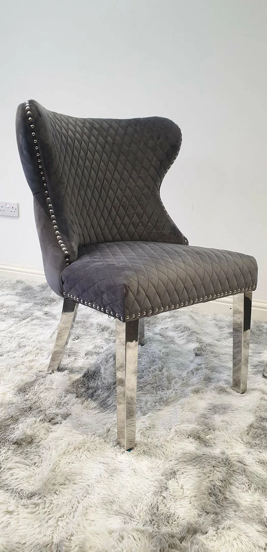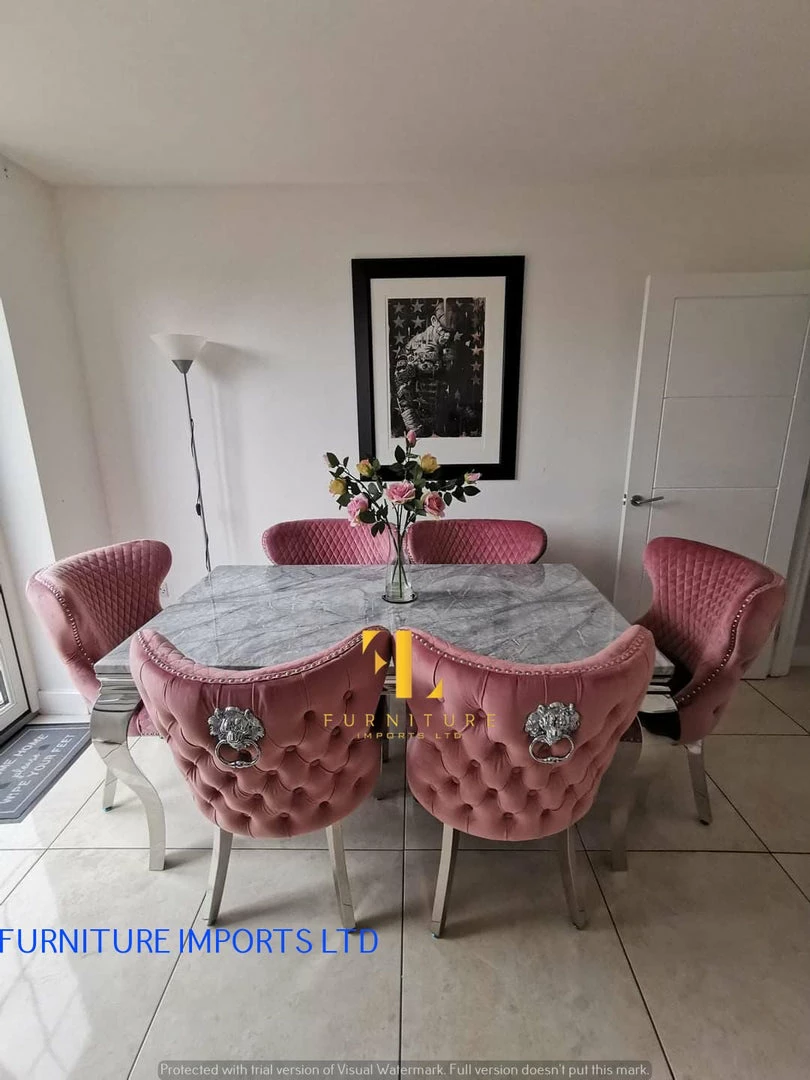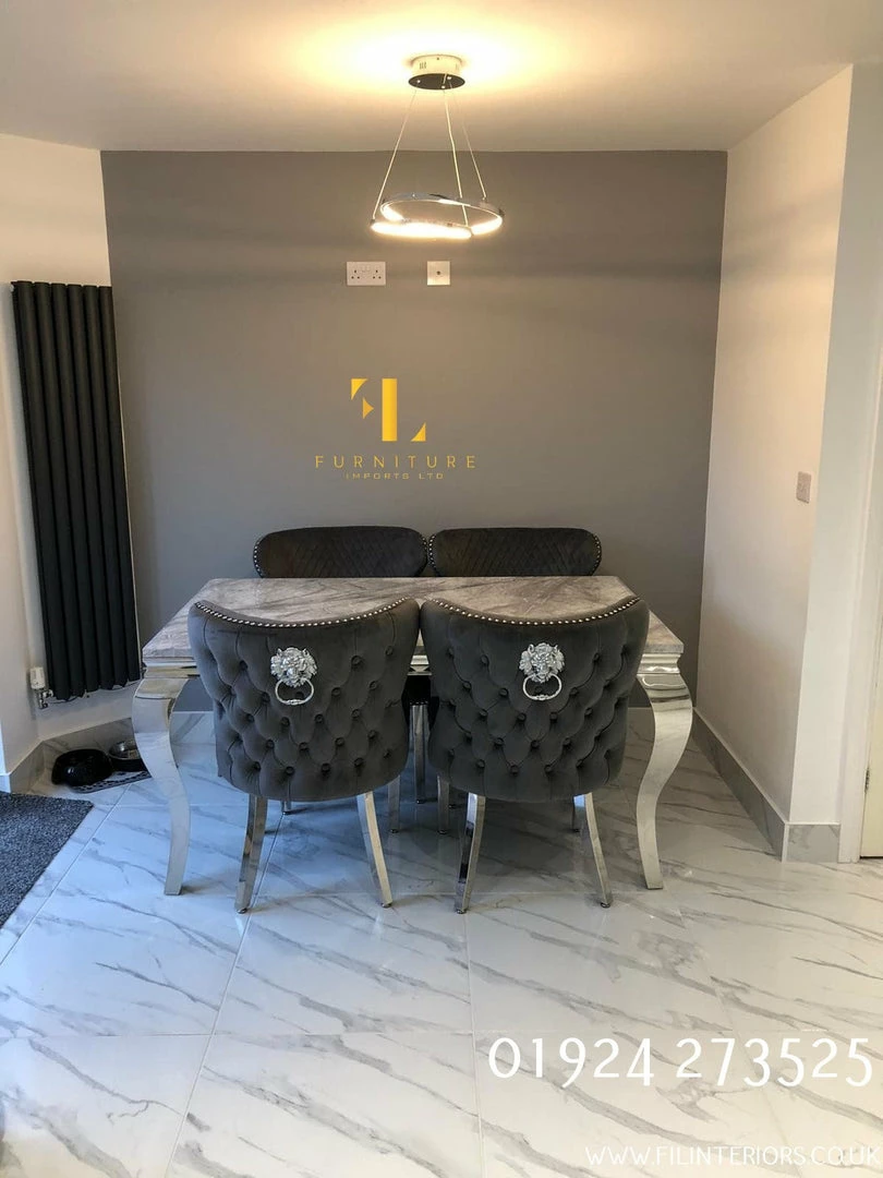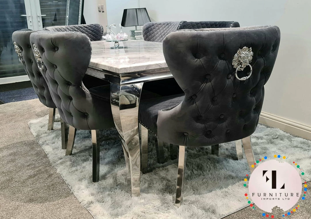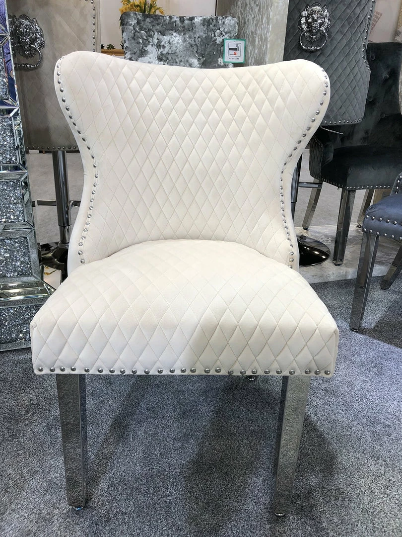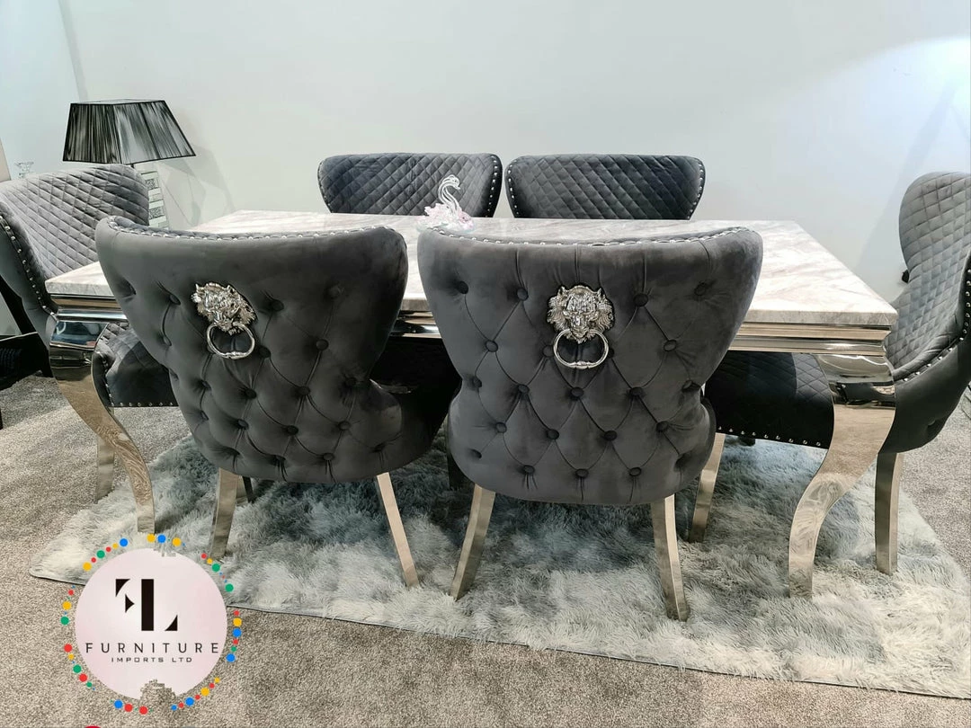 Elegantlyย designed to conquer any modernย interior. This grand Valentino dining chair embodies a prestigious & ergonomic design, with an elegantly wrapped smoothed brushed velvet fabric, swivel, comfortable padding, chic chrome legs, soft tuftedย buttons, a lavish lion knocker back and last but not least a rich pearl embedded detailingย