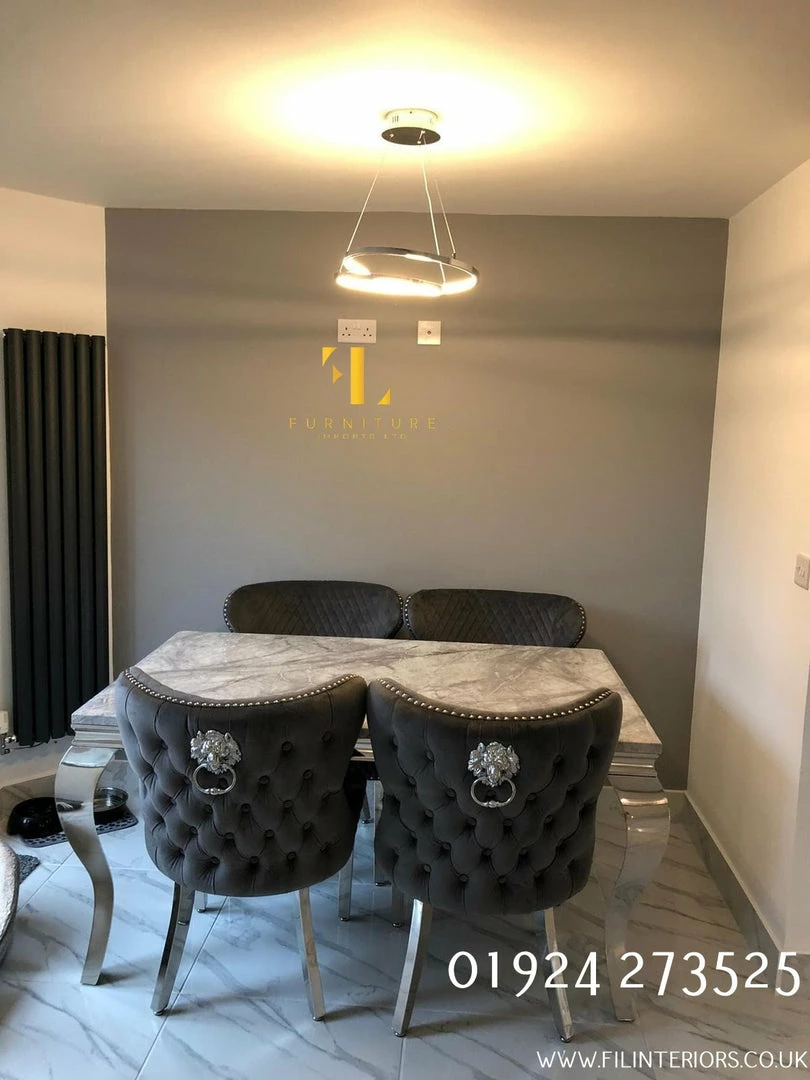 The dining table is constructed from grey and white marble effect ceramicย and boasts a unique and eye-catching chrome base. The marble top is both practical and hard-wearing, with its scratch and chip resistant properties and easy to clean surface.