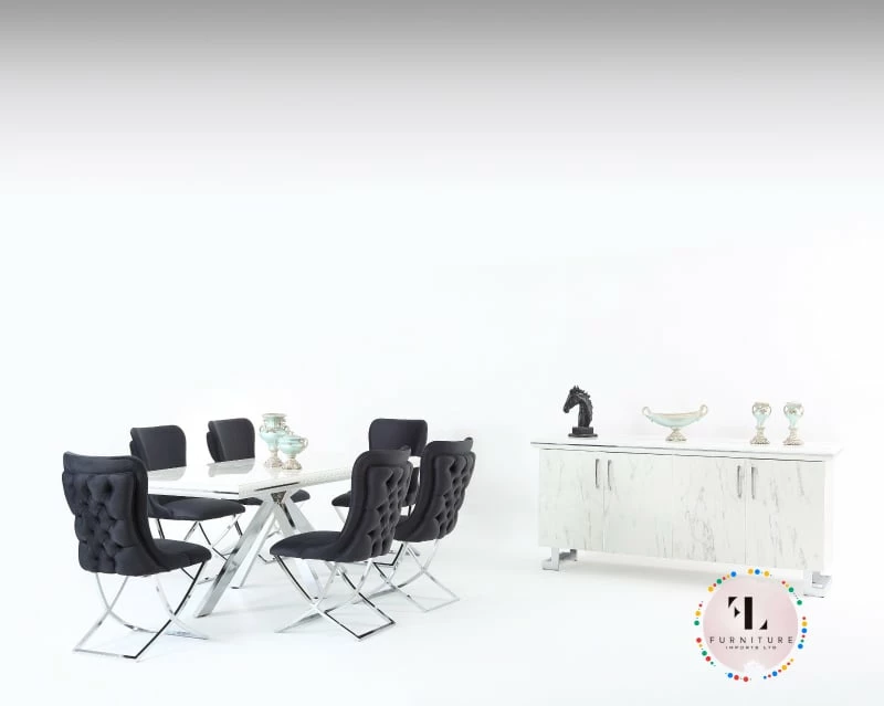 We also have a range of colours available, from glossy white and static black – all of which give a sense of understated style to the shine of the finish on these chrome dining table and chairs. The chairs come in matching shades, and are upholstered in velvet fabric and other fabric options that are stylish, yet practicalย