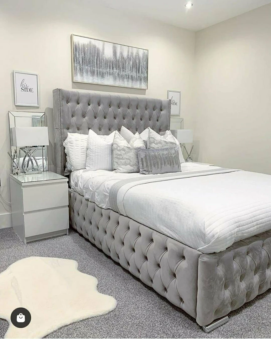 Clad with rich, soothingly Silver velvet and upholstered with a diamond buttoned pattern, the Luxe Curved Wingback Bedย lends itself sublimely to contemporary homes. All the more enriching is the grand and immense headboard, as well as the curved design of the frame