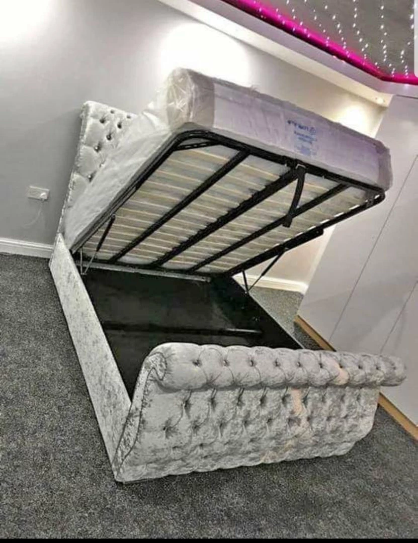 - swan curved uphosltered crushed velvet headboard and foot board with diamantes or button