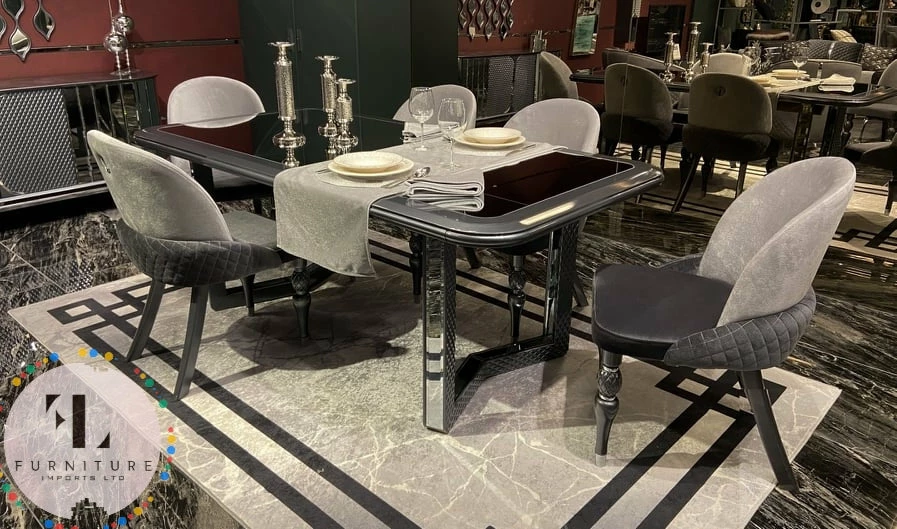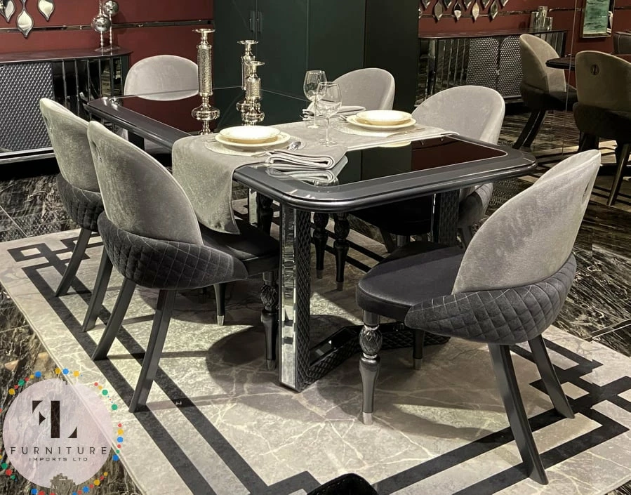 Grey & Chromeย Setย – 180cm Grey And Chrome Table + 6 x Cenova Grey Velvet + Grey Wooden Legs