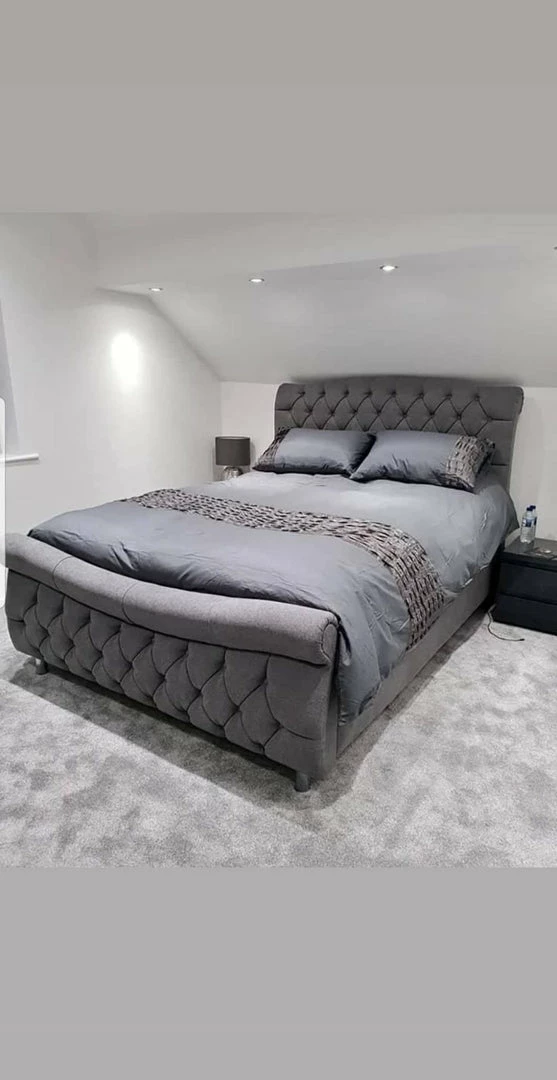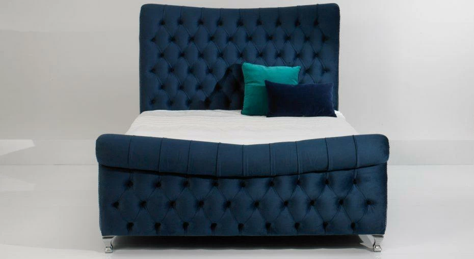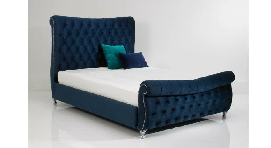 The DEVINA bedstead high foot endย bedstead is a chesterfield style bed frame that features a deeply buttoned headboard and a high deeply buttoned foot end, the scrolled sleigh bed style head-end and foot-end are truly stunning and is sure to make a statement in any bedroom.