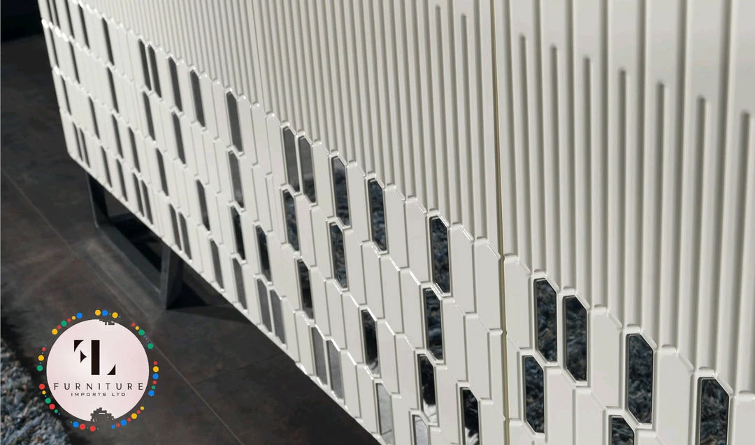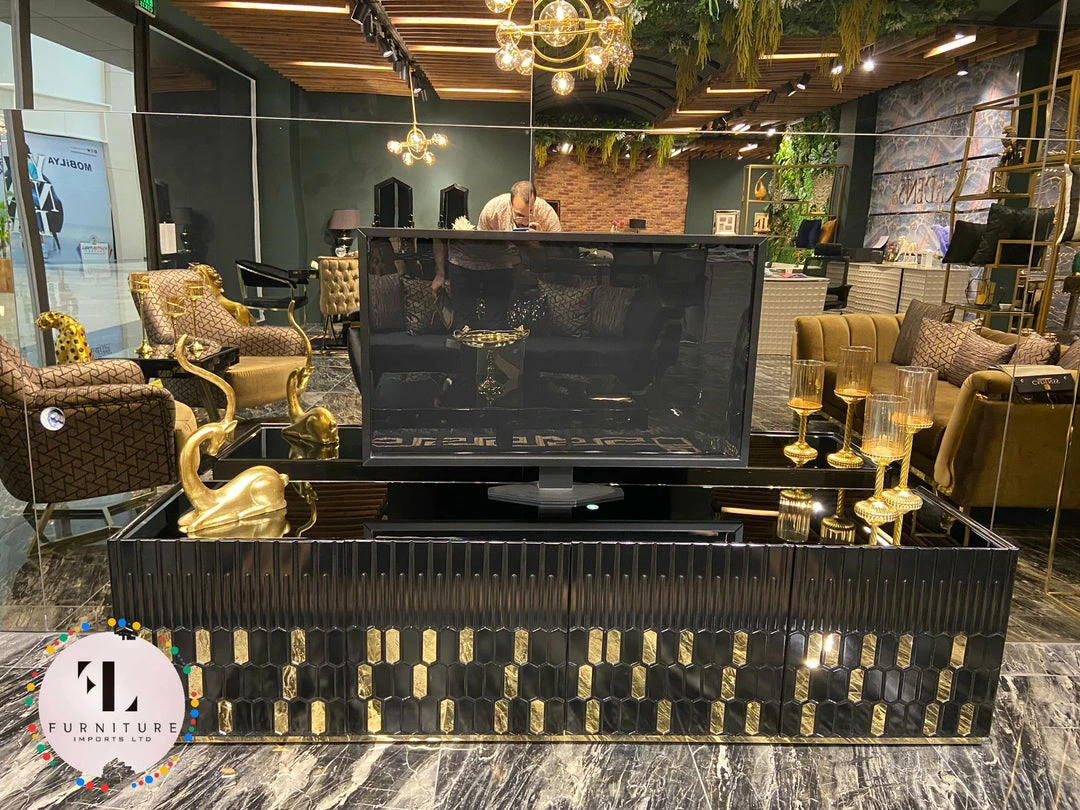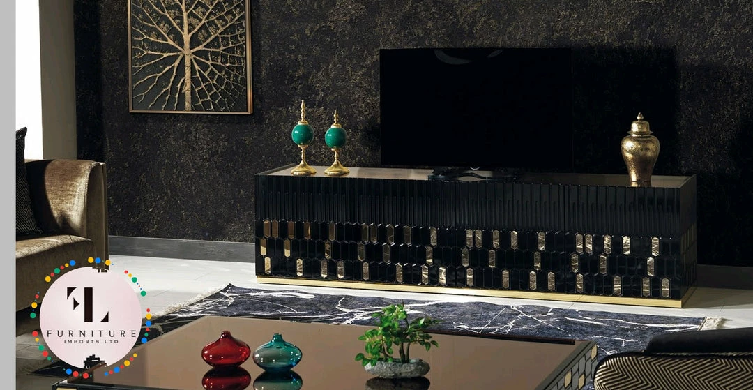 Designed to add a touch of luxe to your space, this dark gloss Tv unit is sure to catch compliments. With rich gloss finished with a parquet design, this unit is timeless and classically beautiful. The gold-plated steel frame and matching handles add a fresh, modern edge with a subtle sparkle, while the large surface top gives you the space to make it your own, ideal for displaying flowers, photos and more. With 4 internal compartments, there’s plenty of room to store anything from barware to book to bits and bobs that need a home.