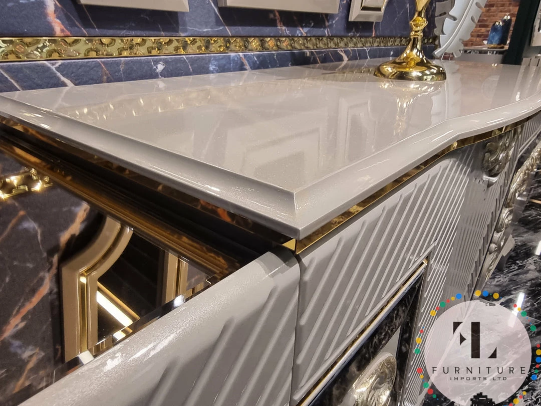 The Verona Sideboard is Designed to add a touch of luxe to your space, this sideboard is sure to catch compliments. With rich gloss finished with a parquet design, this unit is timeless and classically beautiful. The gold-plated steel frame and matching handles add a fresh, modern edge with a subtle sparkle, while the large surface top gives you the space to make it your own, ideal for displaying flowers, photos and more. With 4 internal compartments, there’s plenty of room to store anything from barware to book to bits and bobs that need a home.