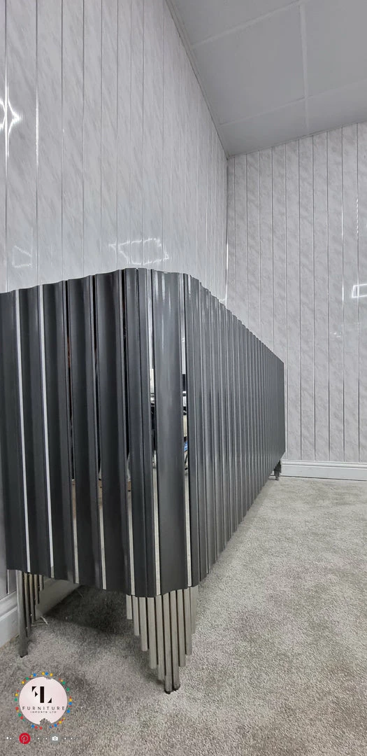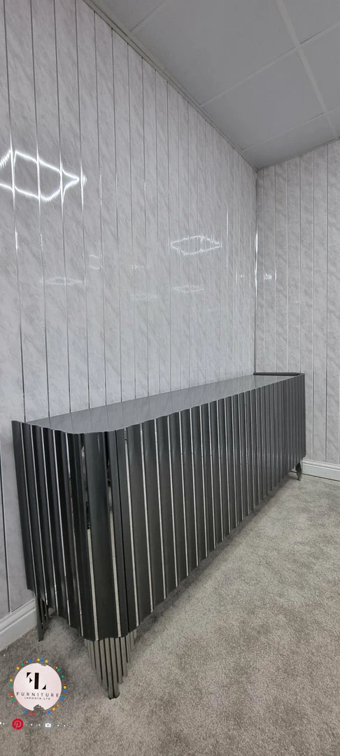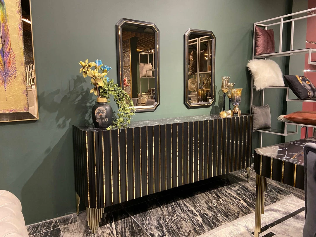 Designed to add a touch of luxe to your space, this dark gloss sideboard is sure to catch compliments. With rich gloss finished with a parquet design, this unit is timeless and classically beautiful. The gold-plated steel frame and matching handles add a fresh, modern edge with a subtle sparkle, while the large surface top gives you the space to make it your own, ideal for displaying flowers, photos and more. With 4 internal compartments, thereโs plenty of room to store anything from barware to book to bits and bobs that need a home.
