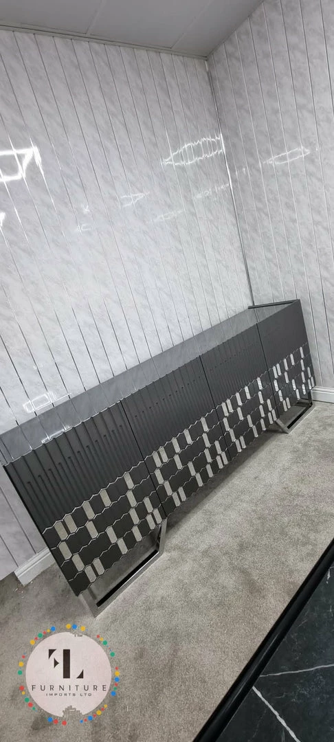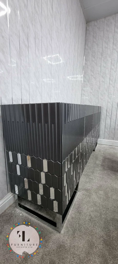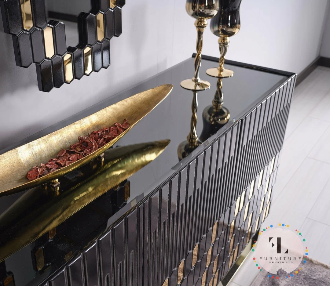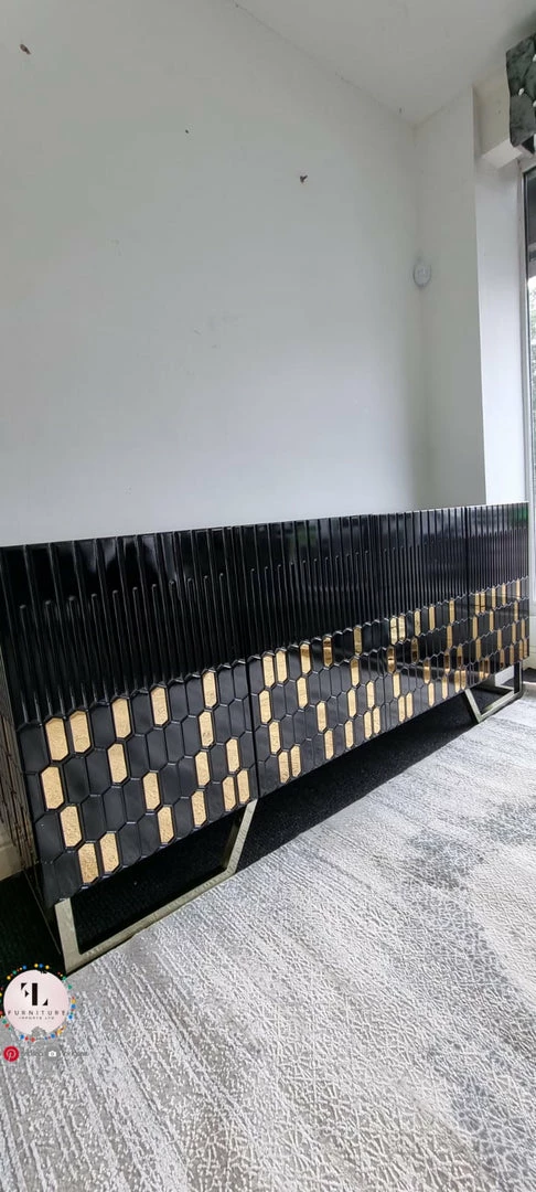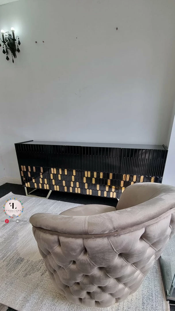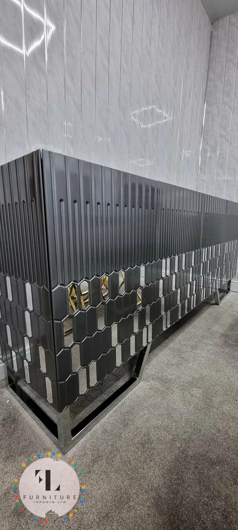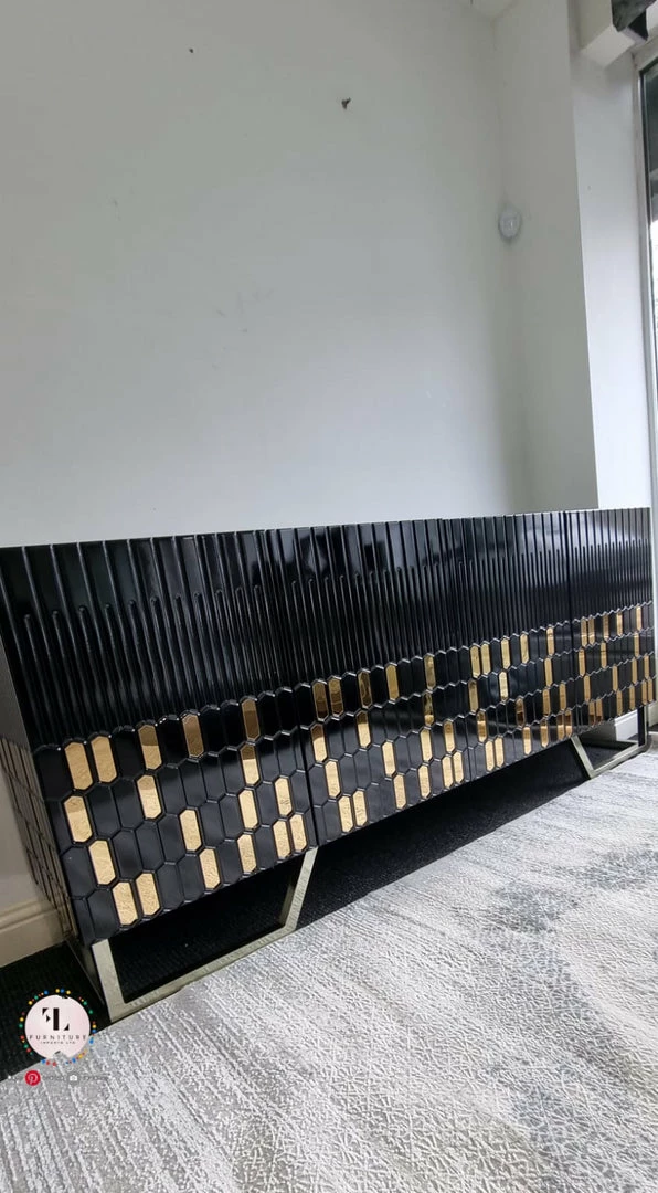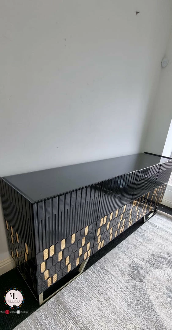 Designed to add a touch of luxe to your space, this dark gloss sideboard is sure to catch compliments. With rich gloss finished with a parquet design, this unit is timeless and classically beautiful. The gold-plated steel frame and matching handles add a fresh, modern edge with a subtle sparkle, while the large surface top gives you the space to make it your own, ideal for displaying flowers, photos and more. With 4 internal compartments, thereโs plenty of room to store anything from barware to book to bits and bobs that need a home.