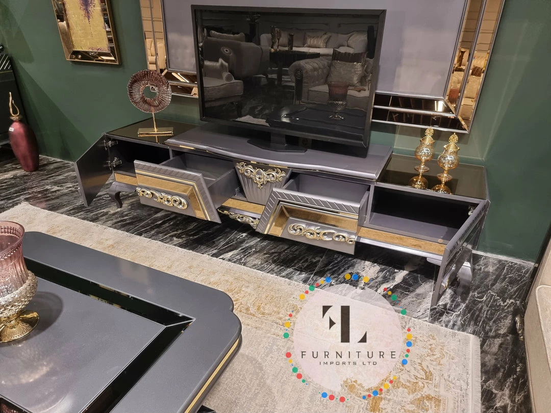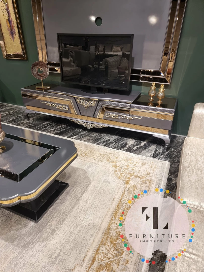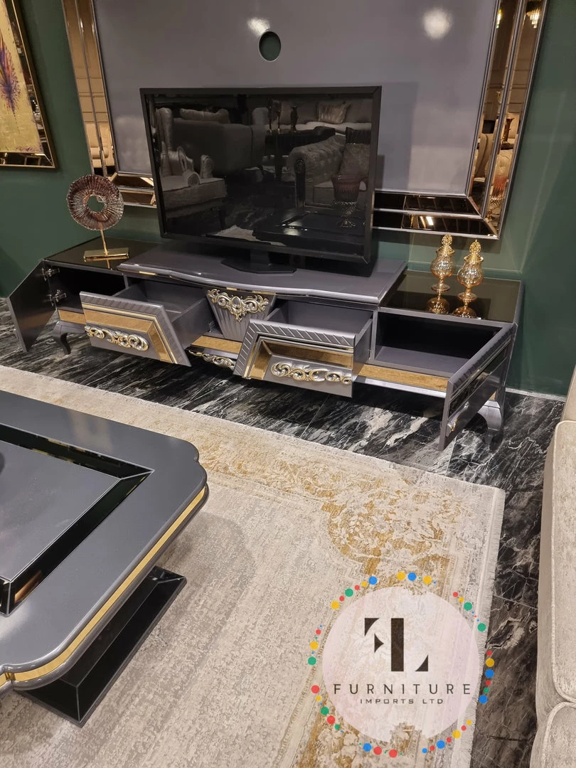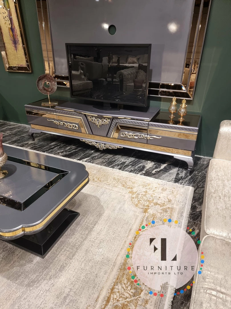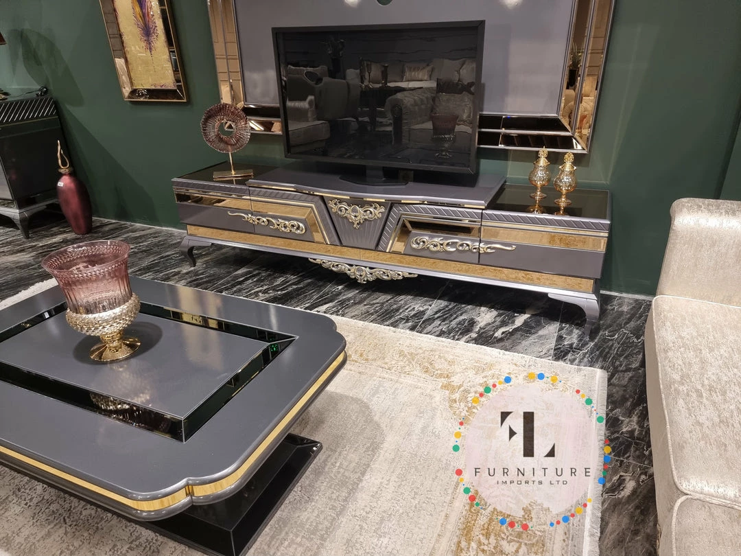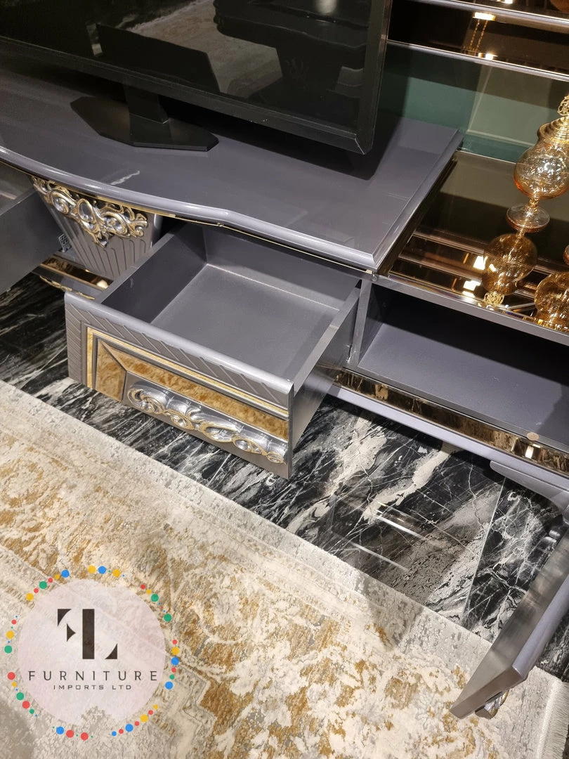 The Veronaย TV Unitย is Designed to add a touch of luxe to your space, this TV Unit is sure to catch compliments. With rich gloss finished with a parquet design, this unit is timeless and classically beautiful. The gold-plated steel frame and matching handles add a fresh, modern edge with a subtle sparkle, while the large surface top gives you the space to make it your own, ideal for displaying flowers, photos and more. Withย 3 internal compartments, thereโs plenty of room to store anything from barware to book to bits and bobs that need a home.