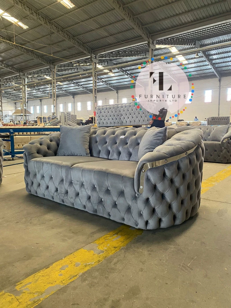 Our customizable take on the classic Chesterfield style—tufted arms comfort meets clean lines. The Upholstered arm shape balances the formality of a Spanish-back tuxedo sofa with the inviting vibe of a more casual, low-armed seat. Its has a beautiful metal trim fused with its unique upholstery. Truly Unique and Timeless
