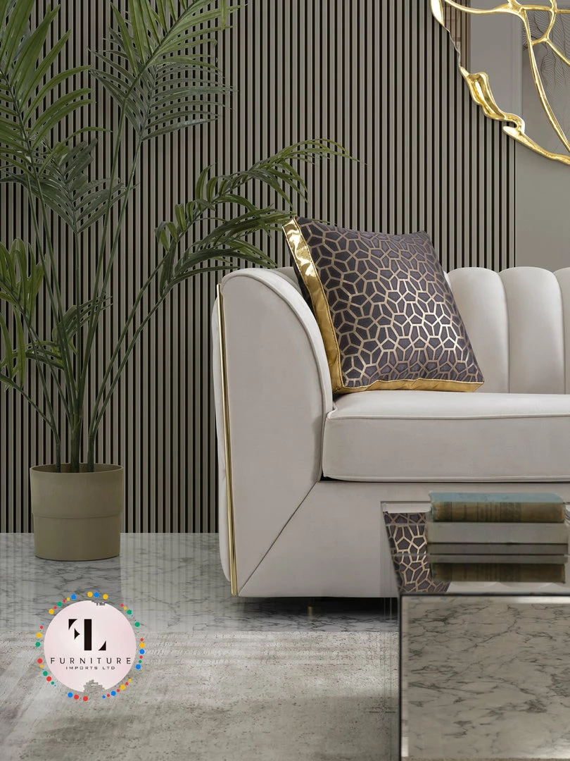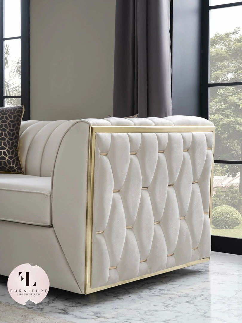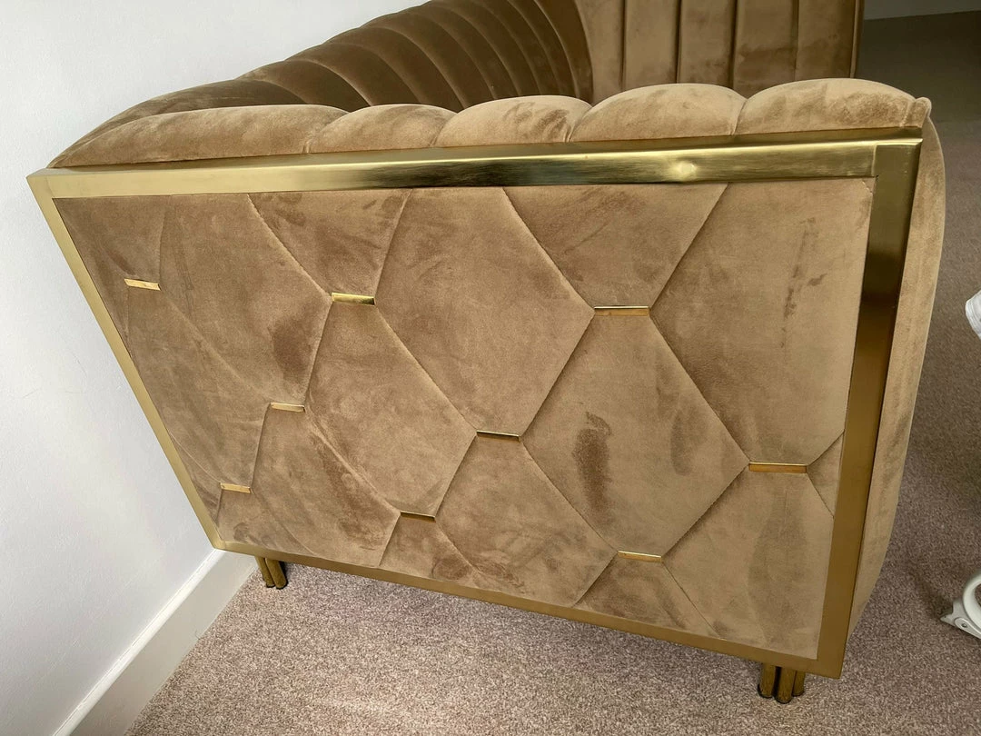 A simple thick padded sofa meets a smooth metal finish. The arm shape balances the formality of a sofa with the inviting vibe of a more casual, low-armed heavily padded seat. Its has a beautiful metal u shaped trim which serves as a leg as well as a unique design on the arms of the sofa. The seat cushions are heavily padded for long durable use. The centre piece give this sofa its own unique branding