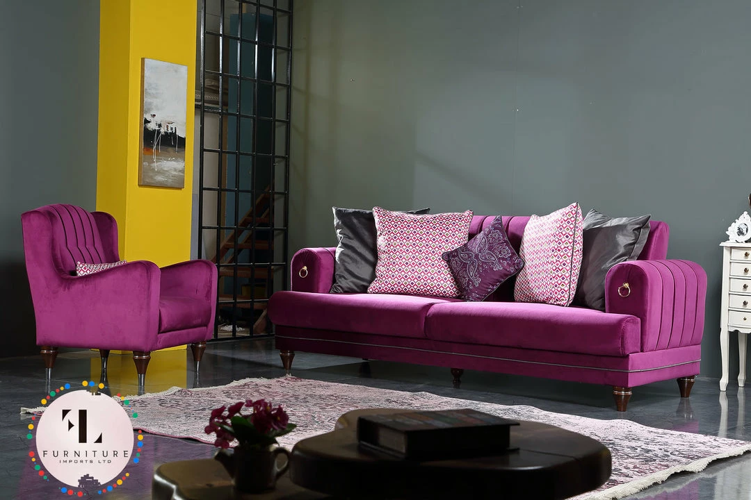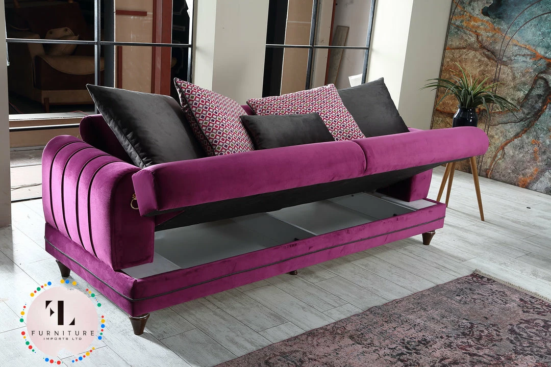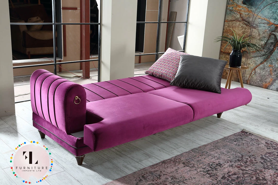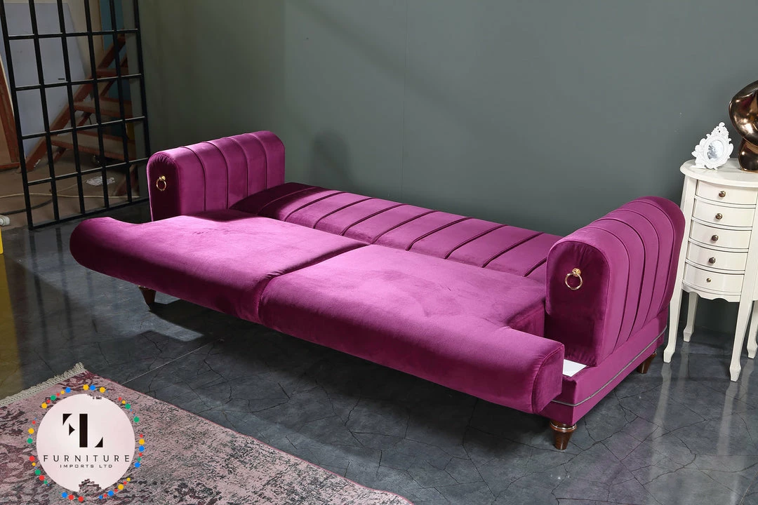 This Lucia sofa is a stunner, and it will surely make your living room look like the cover of an interior design magazine. Its nifty silhouette showcases velvety smooth upholstery spruced up with neat tufting that give it a flair of decadent style. Paired with the straight-lined upholstery on the arms with a beautiful metal ring knocker finish. The brilliance of this sofa goes beyond it luxurious look, as it doubles as a bed thanks to its fold-down backrest. This Lucia sofa will be the most elegant and functional addition to your home.